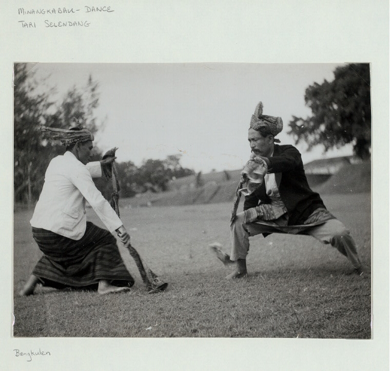 Photo ini adalah Tari Selendang dari Minang Kabau, yang dipertunjukan di Bengkulu (Sepertinya di depan Benteng Fort Marlborough?). Koleksi The New York Public Library.